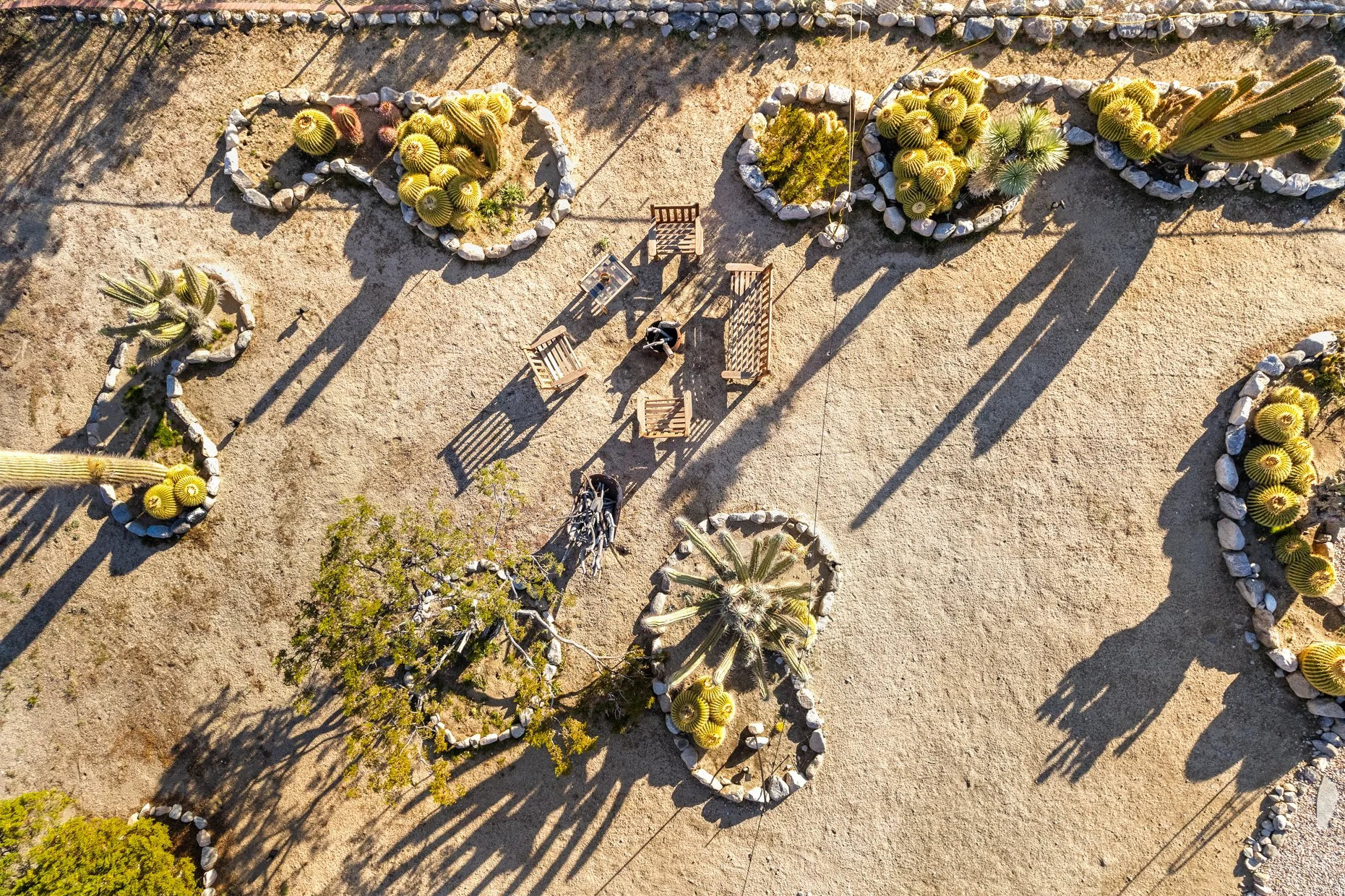 The space sits on a 2 acre yard and is located in Morongo Valley which is the midway point between Palm Springs and Joshua Tree in California. The property has a 2 bedroom 2 bath home that has recently been renovated and curated for ultimate rest and relaxation. The property can be used as an event space that can host up to 75 people comfortably with tables, chairs, a food + bar set-up and an ample dance floor. The property also has a parking area that can fit up to 20 cars.